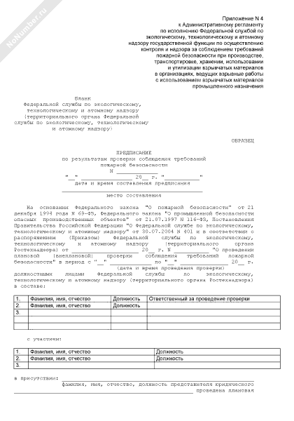 Предписание Федеральной службы по экологическому, технологическому и атомному надзору по результатам проверки соблюдения требований пожарной безопасности (рекомендуемый образец заполнения)
