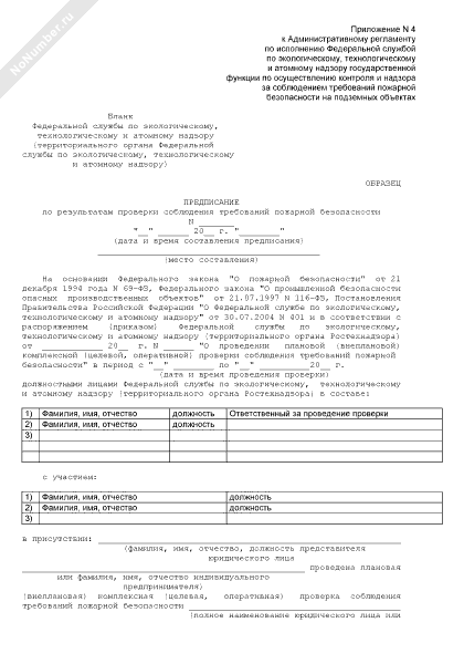 Предписание Федеральной службы по экологическому, технологическому и атомному надзору по результатам проверки соблюдения требований пожарной безопасности (рекомендуемый образец заполнения)