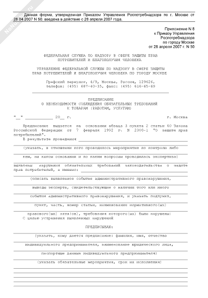 Предписание о необходимости соблюдения обязательных требований к товарам (работам, услугам) в сфере защиты прав потребителей и благополучия человека по городу Москве