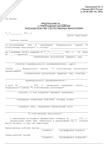 Предписание о прекращении нарушений законодательства о естественных монополиях (рекомендуемый образец заполнения)