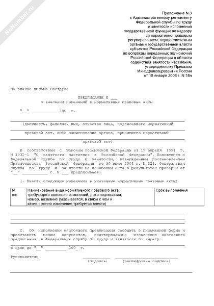Предписание о внесении изменений в нормативные правовые акты субъекта Российской Федерации по вопросам переданных полномочий Российской Федерации в области содействия занятости населения (рекомендуемый образец заполнения)