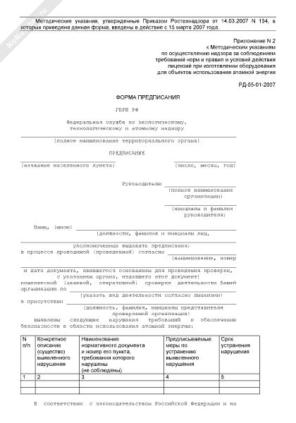Предписание о выявленных нарушениях и требованиях к обеспечению безопасности в области использования атомной энергии (рекомендуемый образец заполнения)