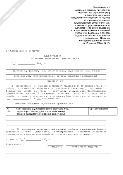 Предписание об отмене нормативных правовых актов субъекта Российской Федерации по вопросам переданных полномочий Российской Федерации в области содействия занятости населения (рекомендуемый образец заполнения)