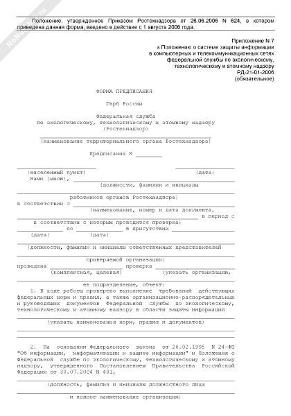 Предписание об устранении нарушений, выявленных в процессе проверки установленных требований и норм по защите информации в компьютерных и телекоммуникационных сетях Федеральной службы по экологическому, технологическому и атомному надзору (рекомендуемый образец заполнения)