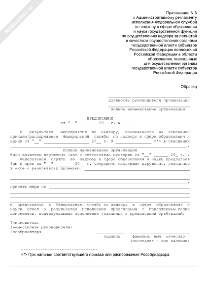 Предписание об устранении нарушений, выявленных при проведении плановой выездной проверки в рамках надзора за полнотой и качеством осуществления органами государственной власти субъектов Российской Федерации полномочий Российской Федерации в области образования (рекомендуемый образец заполнения)