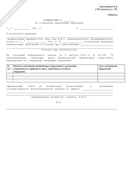 Предписание об устранении выявленных нарушений лицензионных требований и условий при осуществлении лицензируемого вида деятельности на железнодорожном транспорте (рекомендуемый образец заполнения)