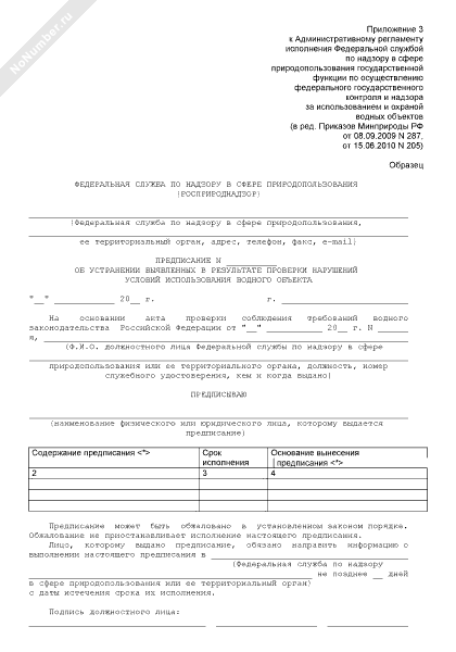 Предписание об устранении выявленных в результате проверки нарушений условий использования водного объекта (рекомендуемый образец заполнения)