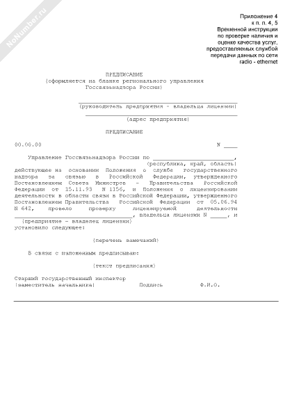 Предписание по результатам проверки лицензируемой деятельности в области связи в Российской Федерации (рекомендуемый образец заполнения)