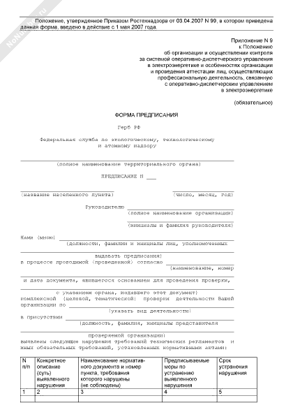Предписание по устранению выявленных нарушений технических регламентов и иных обязательных требований, установленных нормативными и правовыми актами при осуществлении оперативно-диспетчерского управления в электроэнергетике (рекомендуемый образец заполнения)