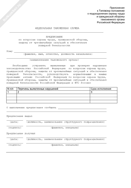 Предписание по вопросам охраны труда, гражданской обороны, защиты от чрезвычайных ситуаций и обеспечения пожарной безопасности таможенного органа Российской Федерации (рекомендуемый образец заполнения)