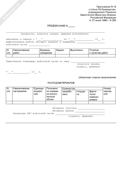 - Источник– Приказ Минобороны РФ от 27.06.1996 № 260
