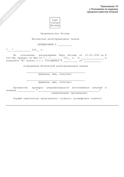Предписание сотрудникам Московской регистрационной палаты на проведение проверки аккредитованного изготовителя печатей и штампов (рекомендуемый образец заполнения)