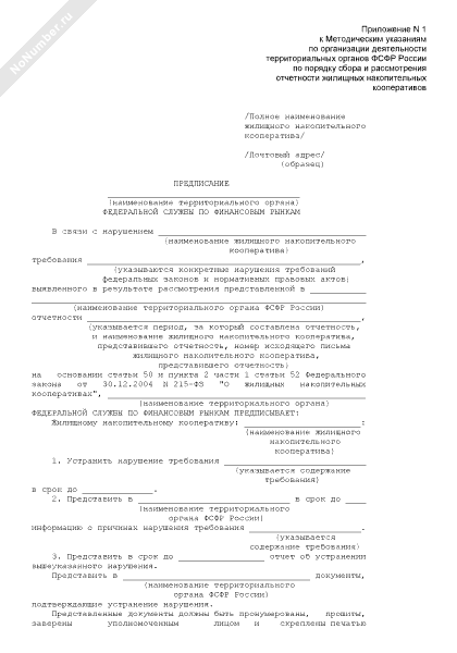 Предписание территориального органа Федеральной службы по финансовым рынкам жилищному накопительному кооперативу (рекомендуемый образец заполнения)