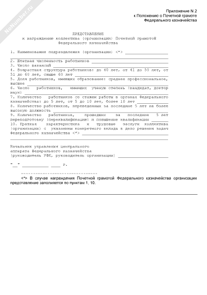 Представление к награждению коллектива (организации) Почетной грамотой Федерального казначейства