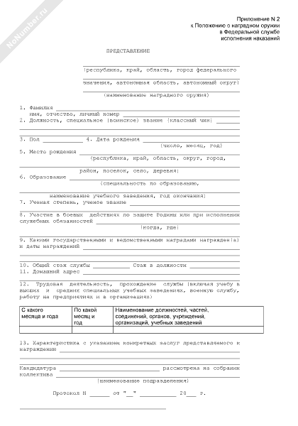 Представление к награждению оружием в Федеральной службе исполнения наказаний (рекомендуемый образец заполнения)