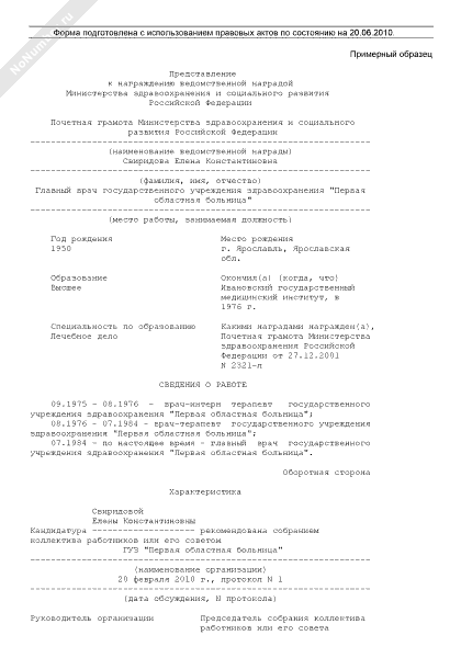 Представление к награждению ведомственной наградой Министерства здравоохранения и социального развития Российской Федерации (рекомендуемый образец заполнения)