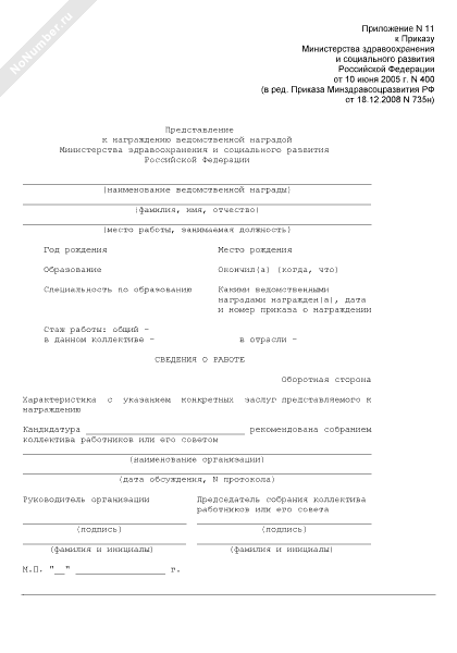 - Источник– Приказ Минздравсоцразвития РФ от 10.06.2005 № 400 (редакция от 18.12.2008 № 735н)