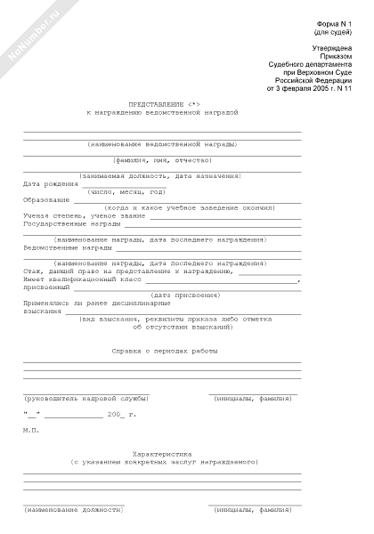 Представление к награждению ведомственной наградой. Форма № 1 (для судей)