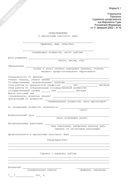 Представление к присвоению классного чина для аппарата Судебного департамента при Верховном Суде Российской Федерации (форма № 1)