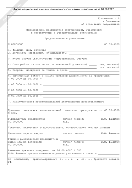 Представление к увольнению сотрудника по результатам аттестации (приложение к положению об аттестации сотрудников)