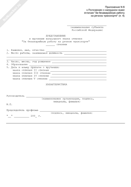 Представление к вручению нагрудного знака отличия Министерства транспорта Российской Федерации «За безаварийную работу на речном транспорте» (рекомендуемый образец заполнения)