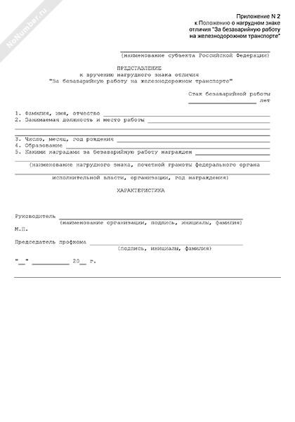 Представление к вручению нагрудного знака отличия «За безаварийную работу на железнодорожном транспорте» (рекомендуемый образец заполнения)
