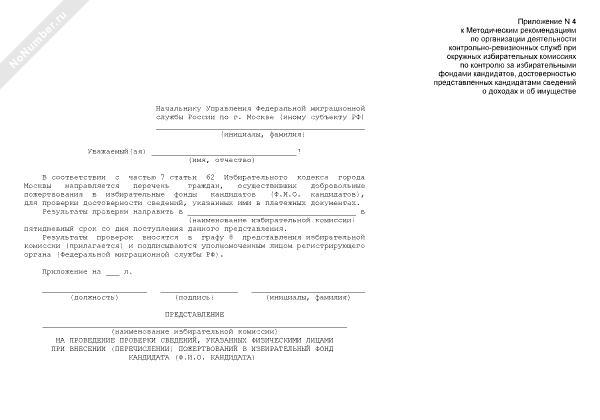 Представление на проведение проверки сведений, указанных физическими лицами при внесении (перечислении) пожертвований в избирательный фонд кандидата(Решение Мосгоризбиркома от 16.07.2009 № 45/4)