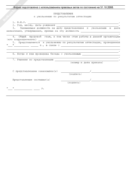Представление к увольнению работника по результатам аттестации