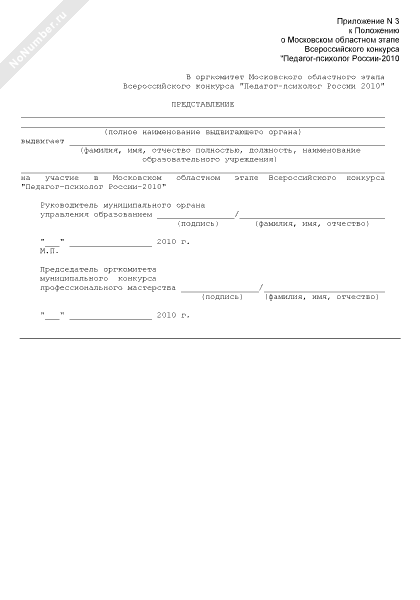 Представление на участие в Московском областном этапе Всероссийского конкурса «Педагог-психолог России-2010» (рекомендуемый образец заполнения)