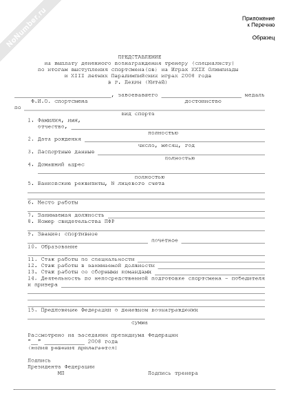 Представление на выплату денежного вознаграждения тренеру (специалисту) по итогам выступления спортсмена(ов) на играх XXIX Олимпиады и XIII летних Паралимпийских играх 2008 года в г. Пекин (Китай) (рекомендуемый образец заполнения)