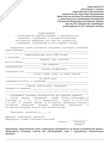 Представление о необходимости принятия решения о нежелательности пребывания (проживания) в Российской Федерации иностранного гражданина или лица без гражданства, подлежащего освобождению из мест лишения свободы