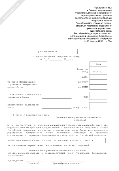 Представление о приостановлении операций по счету, открытому участникам бюджетного процесса в учреждениях Центрального банка Российской Федерации и кредитных организациях в нарушение бюджетного законодательства Российской Федерации (рекомендуемый образец заполнения)