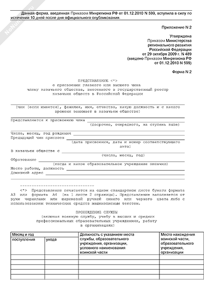Представление о присвоении главного или высшего чина члену казачьего общества, внесенного в государственный реестр казачьих обществ в Российской Федерации (форма № 2)