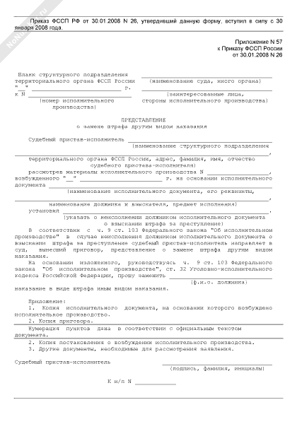 Представление о замене штрафа другим видом наказания в структурном подразделении территориального органа Федеральной службы судебных приставов (рекомендуемый образец заполнения)