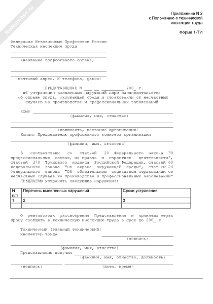 Представление об устранении выявленных нарушений норм законодательства об охране труда, окружающей среды и страховании от несчастных случаев на производстве и профессиональных заболеваний. Форма № 1-ТИ (рекомендуемый образец заполнения)