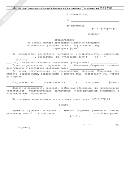 Представление прокурора об особом порядке проведения судебного заседания и вынесения судебного решения по уголовному делу (рекомендуемый образец заполнения)