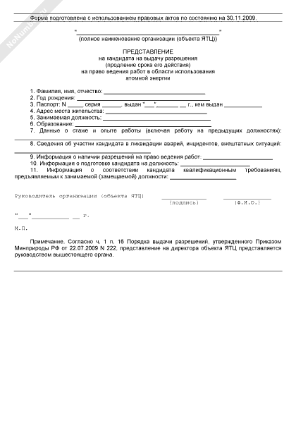 Представление руководителя объекта ядерного топливного цикла или лица, его замещающего, о выдаче разрешения (продлении срока его действия) на право ведения работ в области использования атомной энергии
