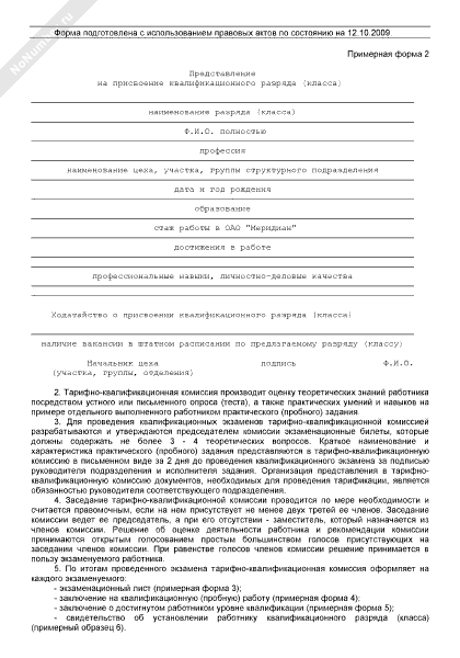 Представление руководителя подразделения для рассмотрения тарифно-квалификационной комиссией вопроса о присвоении или повышении работнику разряда (рекомендуемый образец заполнения)