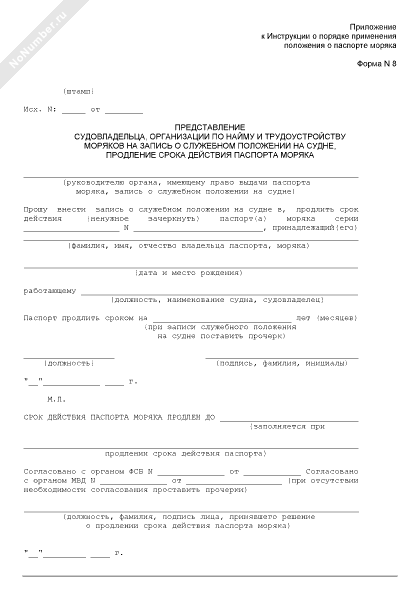Представление судовладельца, организации по найму и трудоустройству моряков на запись о служебном положении на судне, продление срока действия паспорта моряка (форма № 8)
