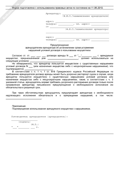 Предупреждение арендодателем арендатора об установлении срока устранения нарушений условий договора о пользовании имуществом (рекомендуемый образец заполнения)