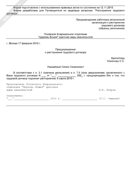 Предупреждение работника религиозной организации о расторжении трудового договора (рекомендуемый образец заполнения)