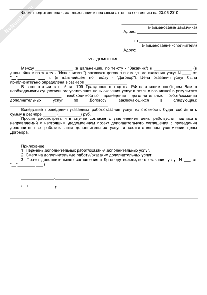 Предупреждение заказчика о необходимости оказания дополнительных услуг по договору возмездного оказания услуг (рекомендуемый образец заполнения)