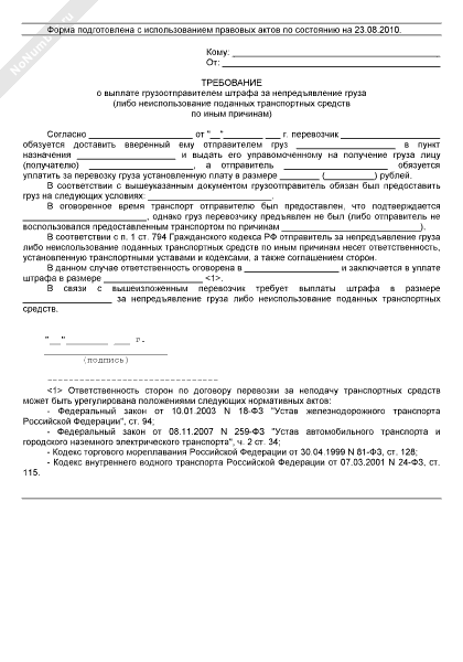 Требование перевозчика о выплате грузоотправителем штрафа за непредъявление груза либо неиспользование поданных транспортных средств по иным причинам