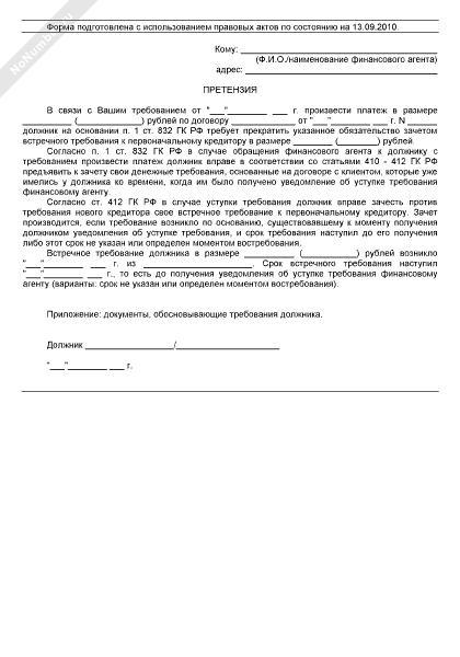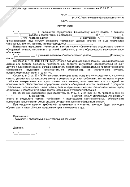 - 30Претензия должника о возвращении финансовым агентом сумм, уплаченных ему в результате уступки денежного требования, в связи с тем, что он не исполнил свое обязательство осуществить клиенту обещанный платеж, связанный с уступкой требования