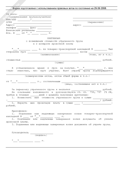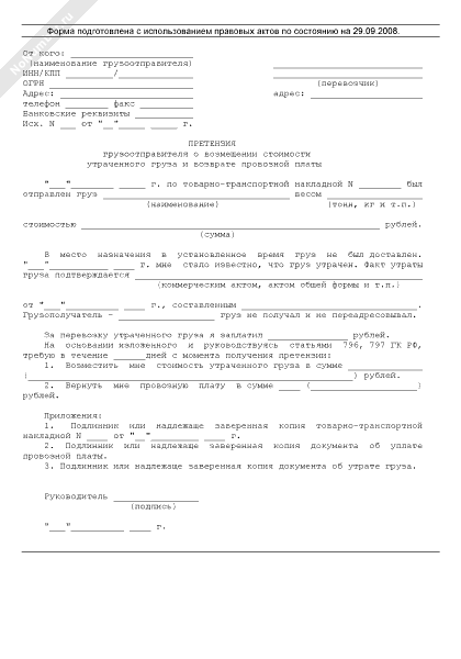 - 22Претензия грузополучателя о возмещении стоимости утраченного груза и о возврате провозной платы