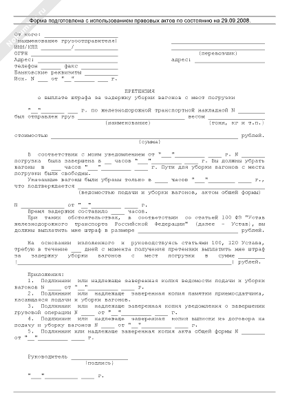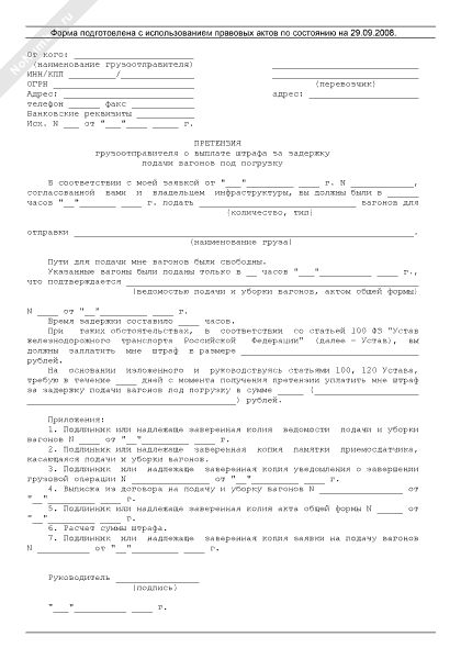 - 24Претензия грузоотправителя о выплате штрафа за задержку подачи вагонов под погрузку