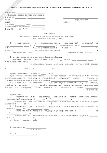 - 25Претензия грузополучателя о выплате штрафа за задержку подачи вагонов под выгрузку