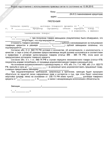 - 36Претензия заемщика о замене переданного по договору товарного кредита некомплектного товара на товар в комплекте