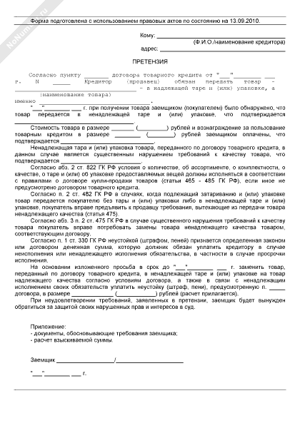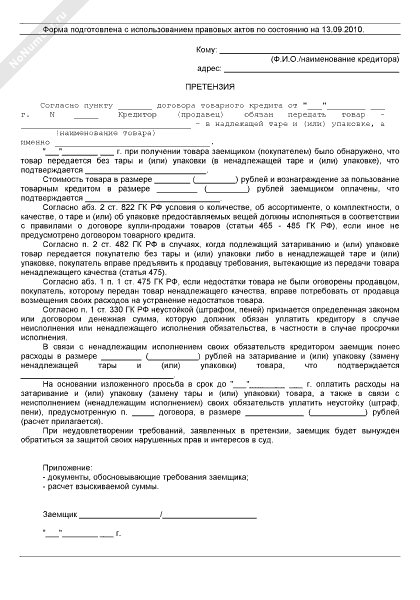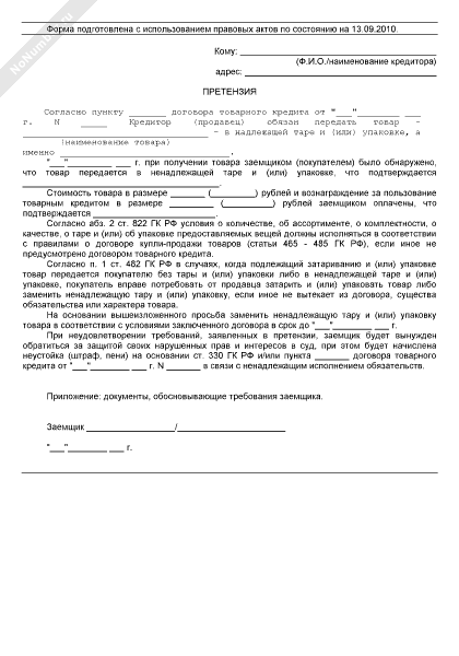- 34Претензия заемщика о замене кредитором товара, переданного по договору товарного кредита, в ненадлежащей таре и (или) упаковке на товар надлежащего качества