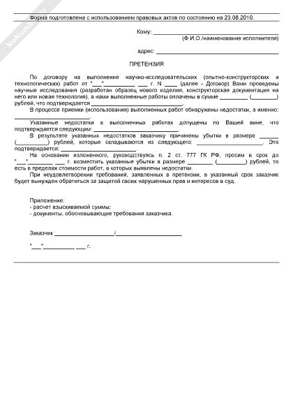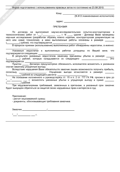 - 39Претензия заказчика по договору на выполнение научно-исследовательских работ, опытно-конструкторских и технологических работ о возмещении исполнителем убытков, причиненных им заказчику, в связи с недостатками работы, а также упущенной выгоды